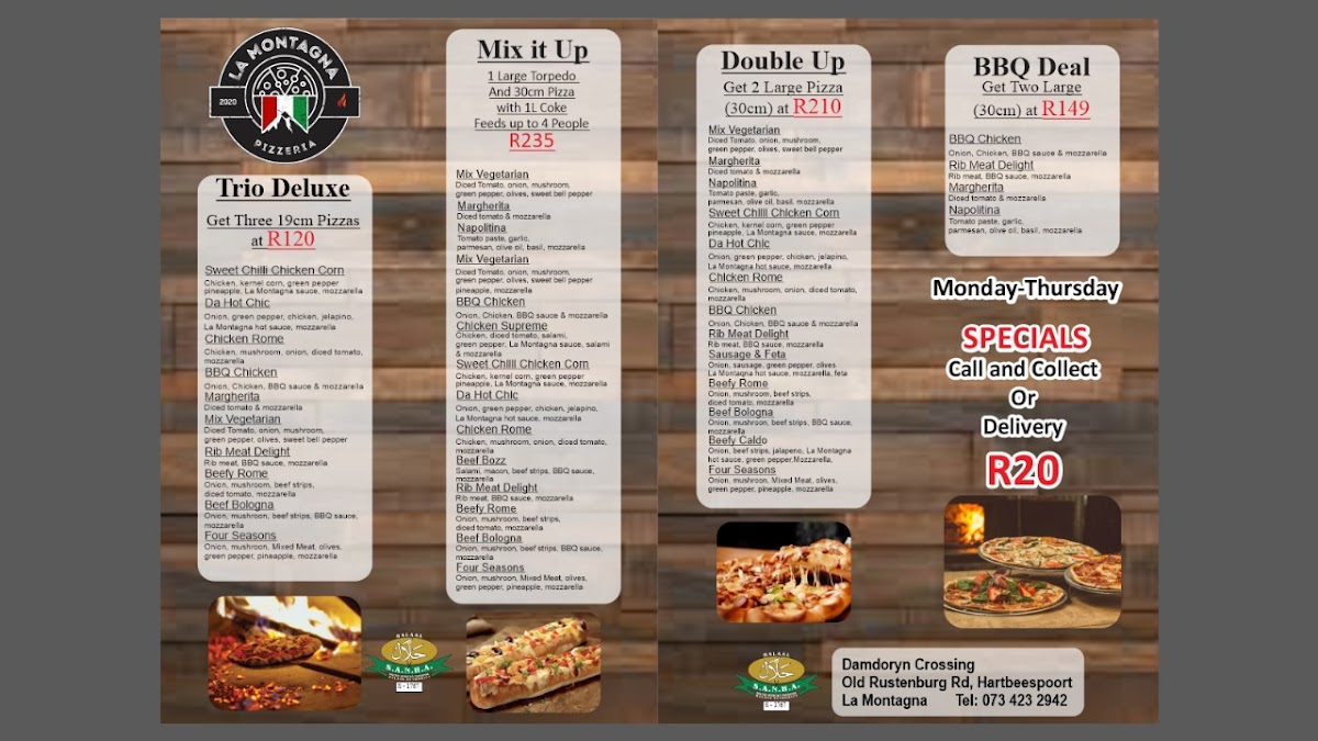 Welcome to La Montagna Halaal Pizzeria, your go-to destination for authentic pizza in Hartbeespoort. Conveniently located at the corner of Old Rustenburg Road & R512, this pizzeria promises a delightful dining experience for families and food lovers alike.